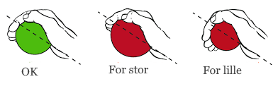 Læg mærke til hvor fingerspidserne slutter i forhold til den stiplede linie, som i øvrigt ligger parallel med din underarm, og går gennem kuglens centrum. Hvis dine fingerspidser gør det samme som på den grønne kugle, er din kuglens diameter(størrelse) helt fin.