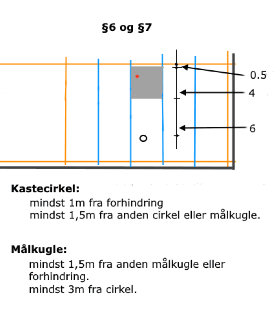 - Afstanden mellem målkuglen og cirklens indvendige kant skal være mindst 6 meter og højst 10 meter for juniorer og seniorer.